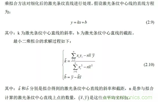 選取激光條紋中心線上的兩個點作為激光條紋的特征點,為了提高激光條紋中心線的提取精度,利用最小二乘法擬合方法對細(xì)化后的激光條紋直線進(jìn)行處理。