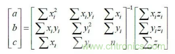 至此,得到四個激光條紋特征點的圖像坐標(biāo),由上式得四個激光條紋特征點在攝像機坐標(biāo)系下的坐標(biāo),由于三點確定一個平面方程,使用最小二乘法計算結(jié)構(gòu)光平面方程如下: