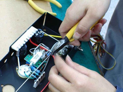 (4)用鑷子轉(zhuǎn)動(dòng)引線(xiàn),確認(rèn)不松動(dòng),然后可用偏口鉗剪去多余的引線(xiàn)。