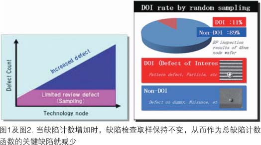 半導體制造中廣泛采用晶圓自動檢測系統(tǒng)已逾30年。在線晶圓檢測有助于推進制造技術(shù)的發(fā)展,它能早期檢測到工藝中的缺陷,從而減少開發(fā)時間并防止產(chǎn)出超時。過去,檢測缺陷的能力是主要關(guān)注點之一,但現(xiàn)在的要求改變了。近幾年來,每一晶圓的缺陷計數(shù)迅速增長至每一晶圓多達100萬個缺陷,這是因為晶圓尺寸變大,同時檢測技術(shù)靈敏度更高了(圖1)。雖然總檢測計數(shù)增加及關(guān)鍵缺陷尺寸變得更小,這一時期缺陷檢查的典型策略并未改變,尤其是在隨機取樣占主導的缺陷檢查區(qū)域。這種情況能產(chǎn)生常與干擾缺陷在一起的缺陷pareto圖(圖2)。