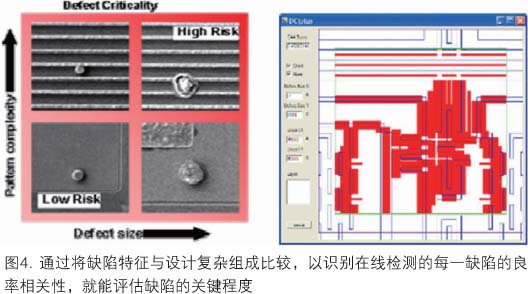 為了提高監(jiān)測和識別關(guān)鍵缺陷的效率,必須采用新方法。依賴簡單的缺陷過濾和基于大小的缺陷次序是不夠的。為了取得最佳的檢測和鑒評預算,必須對檢測設(shè)置與鑒評策略二者使用新的知識信息。從設(shè)計和模擬得到的關(guān)鍵區(qū)域和熱點這樣一些知識信息可以插入檢測方略中,優(yōu)化可用的檢測容量。在完成檢測過程中和完成后,基于多重檢測結(jié)果的缺陷過濾和分類使用戶能快速識別新缺陷,有效地量化已知的缺陷類型。利用設(shè)計空間中缺陷鄰近位置的信息(此處,設(shè)計的復雜組成是了解的),可以較好地評估每一缺陷的良率相關(guān)性,提供缺陷的排序(圖4)。